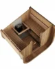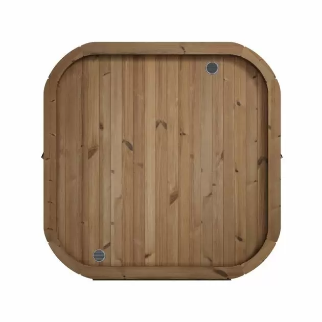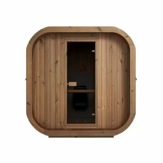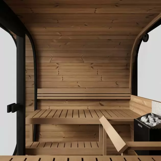Badstuen er bygget med 42 mm tykke vegger i Thermowood, som gir utmerket isolasjon og høy slitestyrke. Innvendig finner du benker i varmebehandlet furu med ryggstøtter, som sikrer komfortabel sittestilling.