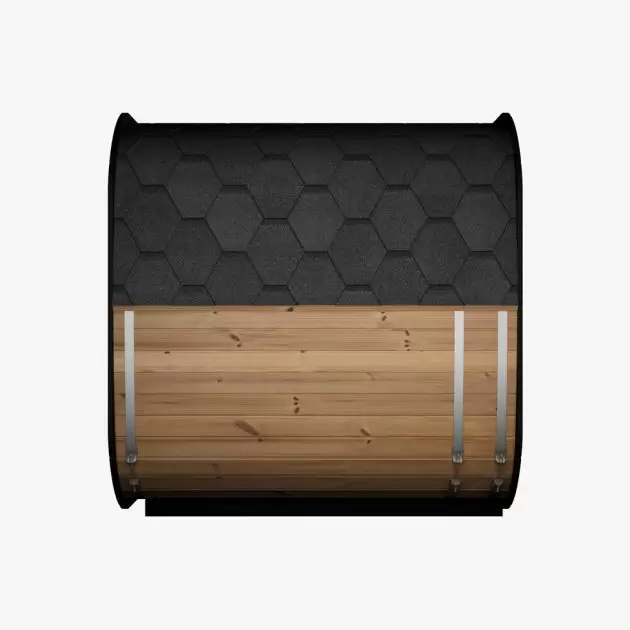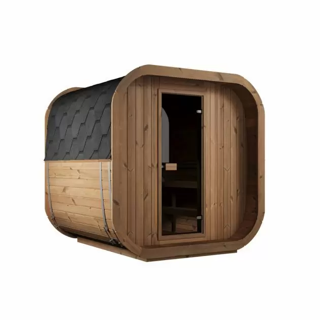 Den store glassdøren gir et moderne uttrykk og slipper inn naturlig lys, noe som skaper en lys og innbydende atmosfære. I tillegg kan du tilpasse utseendet med valgfri takshingel, slik at badstuen får et personlig preg og harmonerer med omgivelsene.