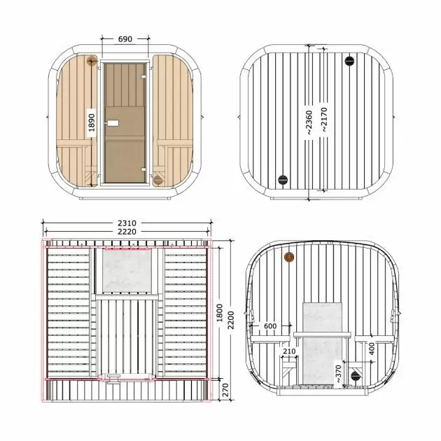 Icon Sauna 220XL Thermowood er en romslig og luksuriøs badstue designet for 4–6 personer, og gir en avslappende og fornyende opplevelse. Med et fotavtrykk på 2,3 × 2,2 m tilbyr den god plass samtidig som den har et kompakt format som passer til ulike installasjonsmiljøer.