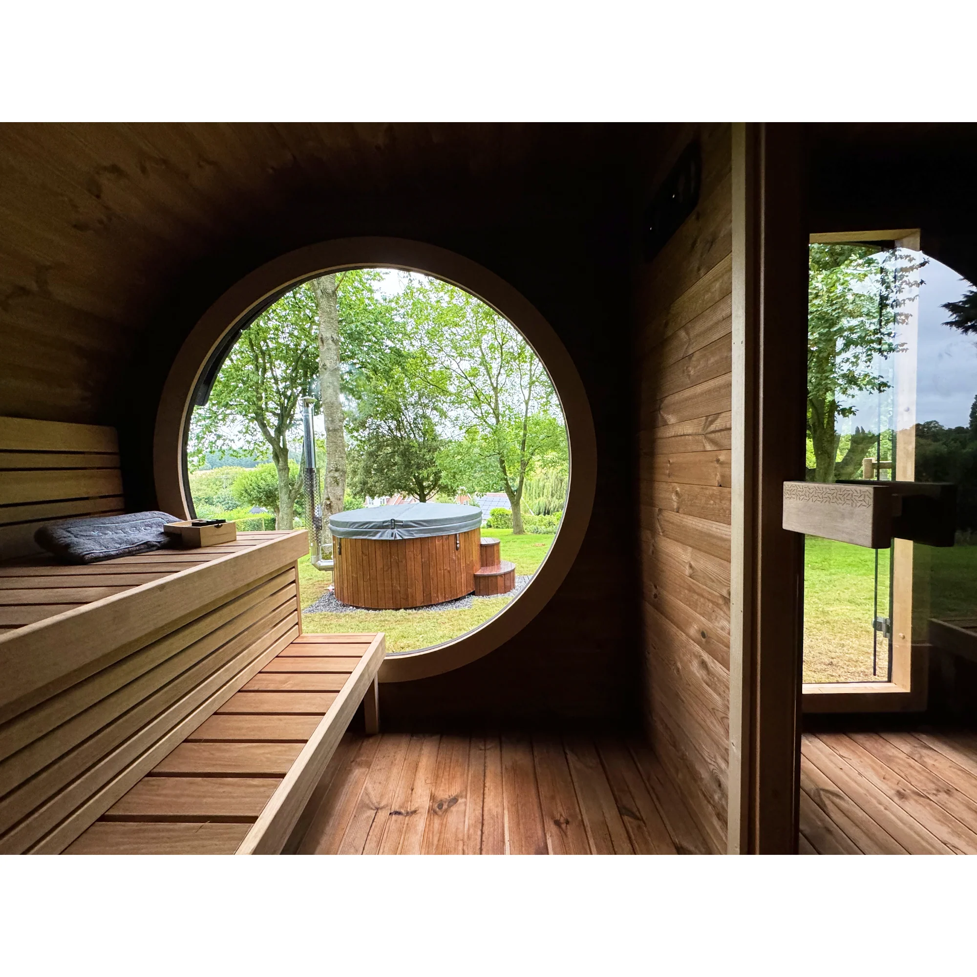 Inne i badstuen er det god plass til flere personer, med benker i flere nivåer som utnytter det ovale designet optimalt og sikrer jevn varmefordeling. De store panoramavinduene, eller valgfrie glassvegger – slipper inn naturlig lys og gir en åpen følelse, samtidig som de knytter saunaopplevelsen tettere til omgivelsene ute.